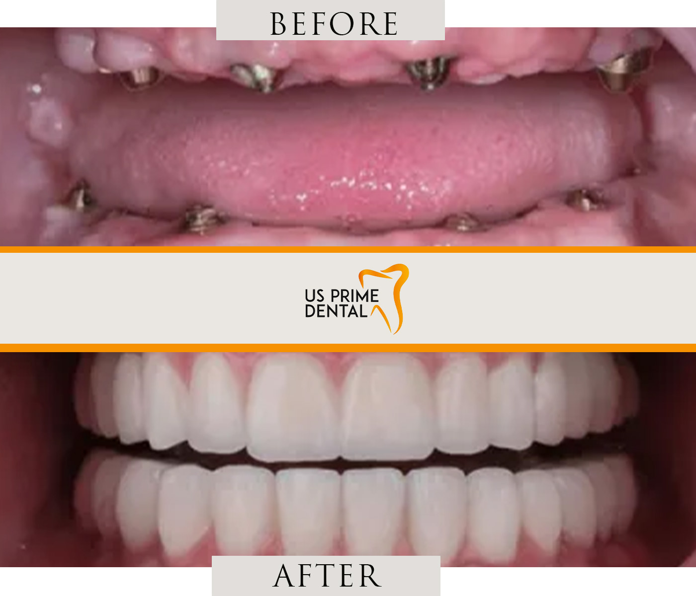 At US Prime Dental, this advanced treatment is designed for patients with extensive tooth loss who are seeking a fixed, long-term solution. By using strategically placed titanium implants as a strong foundation, we secure a full-arch restoration that closely replicates the look, feel, and function of natural teeth. This approach delivers improved chewing efficiency, exceptional stability, faster recovery compared to traditional methods, and a durable alternative to removable dentures—restoring comfort, confidence, and everyday function.